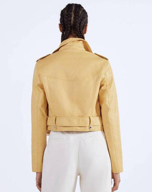 The insulated jacket is made of leather. A light layer of insulation. Details: stand-up collar, zipper, two pockets on the sides.